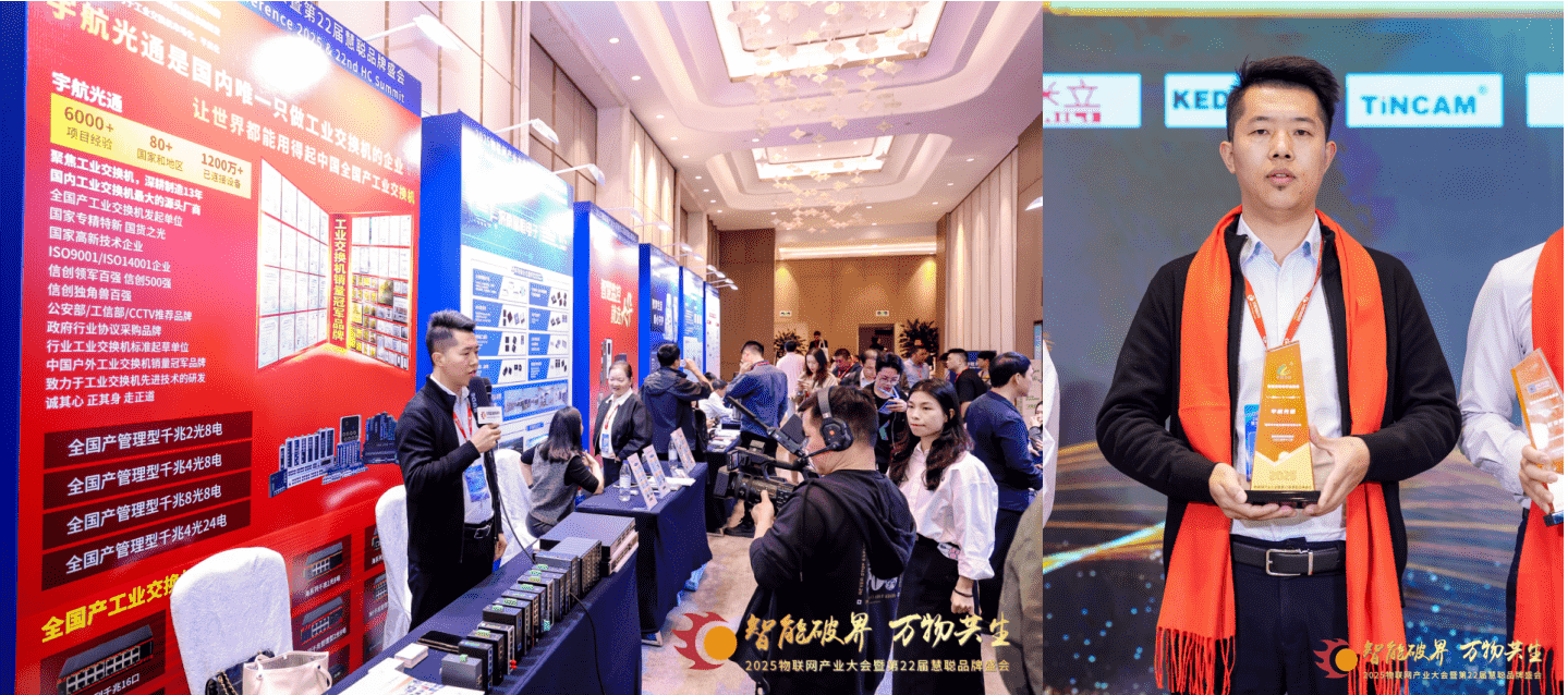 12月10日,宇航副總經理張玉平代表公司出席慧聰年會盛典。活動現場,宇航展示了全國產工業(yè)交換機代表產品;期間,張總接受了慧聰的現場專訪,圍繞產品研發(fā)方向、市場落地實踐等核心內容展開分享。當晚的頒獎典禮環(huán)節(jié),宇航憑借產品硬實力與技術優(yōu)勢,再次榮獲 “智能安防標桿品牌” 稱號。
