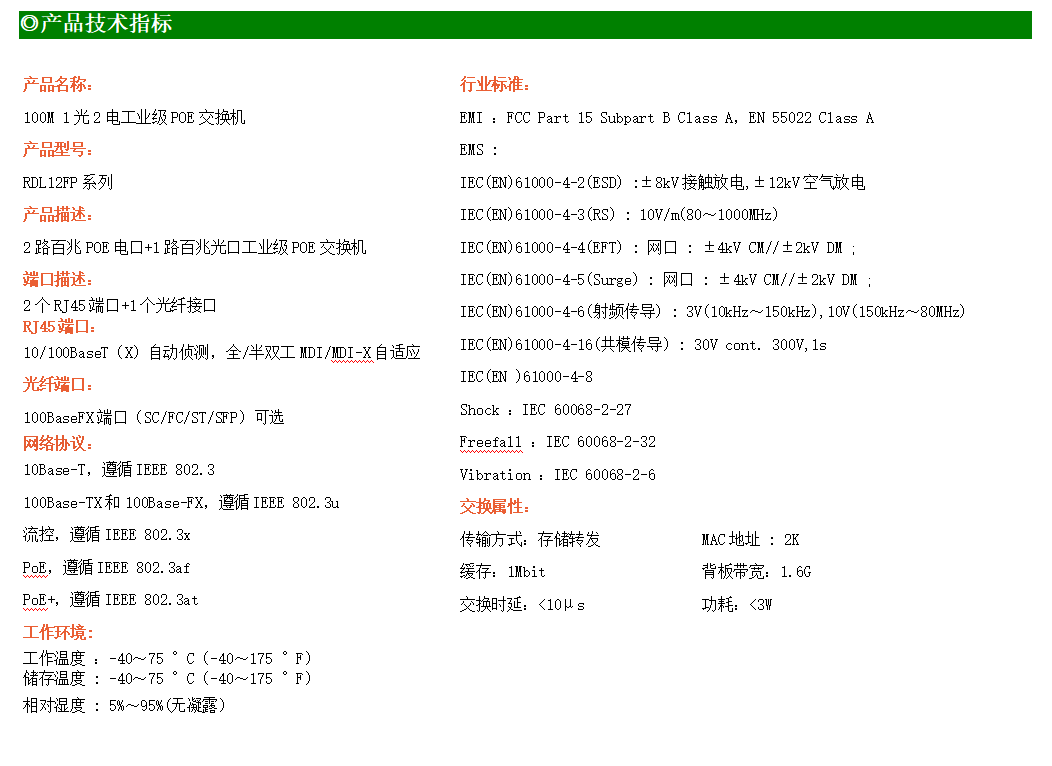 2路百兆POE電口+1路百兆SC光口工業級以太網POE交換機,支持2個10/100Base-TX電口和1個100Base-X光口。產品符合FCC、CE、ROHS標準。RDL12FP系列交換機具有-40℃~75℃的工作溫度,具有超強的堅固度能適應各種嚴苛環境,也可以非常方便的安置在空間緊湊的控制箱中。導軌的安裝特性、寬溫操作及擁有IP40防護等級的外殼及LED指示燈,使RDL12FP成為一個即插即用的工業級設備,為用戶的以太網設備聯網提供可靠、便捷的解決方案。