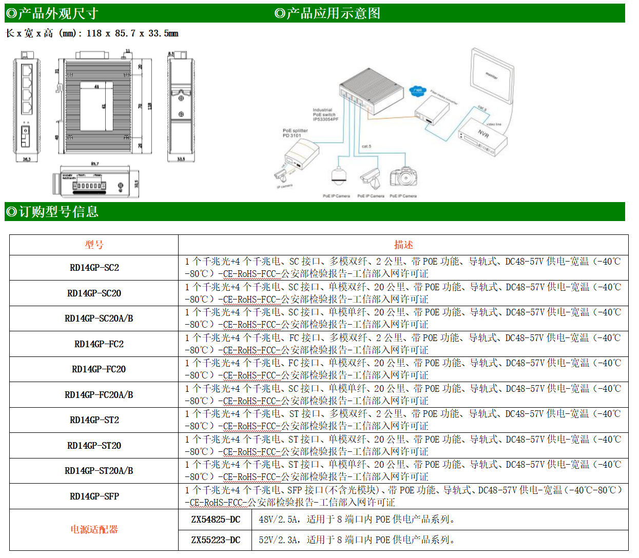 4路千兆POE電口+1路千兆FX光口工業(yè)級以太網(wǎng)POE交換機,支持4個10/100/1000Base-TX電口和1個1000Base-X光口。產(chǎn)品符合FCC、CE、ROHS標準。RD14GP系列交換機具有-40℃~80℃的工作溫度,具有超強的堅固度能適應各種嚴苛環(huán)境,也可以非常方便的安置在空間緊湊的控制箱中。導軌的安裝特性、寬溫操作及擁有IP40防護等級的外殼及LED指示燈,使RD14GP成為一個即插即用的工業(yè)級設備,為用戶的以太網(wǎng)設備聯(lián)網(wǎng)提供可靠、便捷的解決方案。