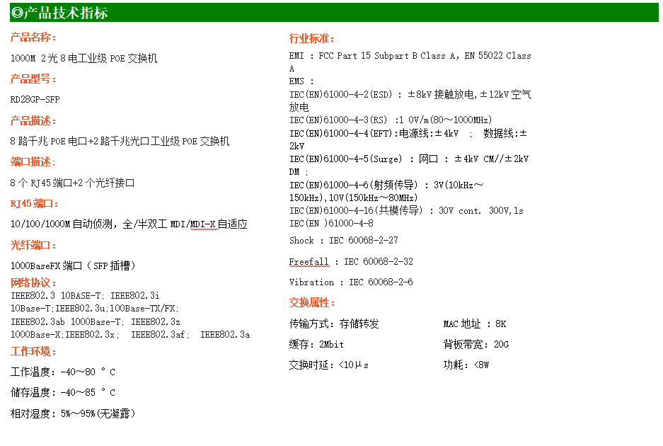 8路千兆POE電口+2路千兆FX光口工業級以太網POE交換機,支持8個10/100/1000Base-TX電口和2個1000Base-X光口。產品符合FCC、CE、ROHS標準。RD28GP-SFP交換機具有-40℃~80℃的工作溫度,具有超強的堅固度能適應各種嚴苛環境,也可以非常方便的安置在空間緊湊的控制箱中。導軌的安裝特性、寬溫操作及擁有IP40防護等級的外殼及LED指示燈,使RD28GP-SFP成為一個即插即用的工業級設備,為用戶的以太網設備聯網提供可靠、便捷的解決方案。