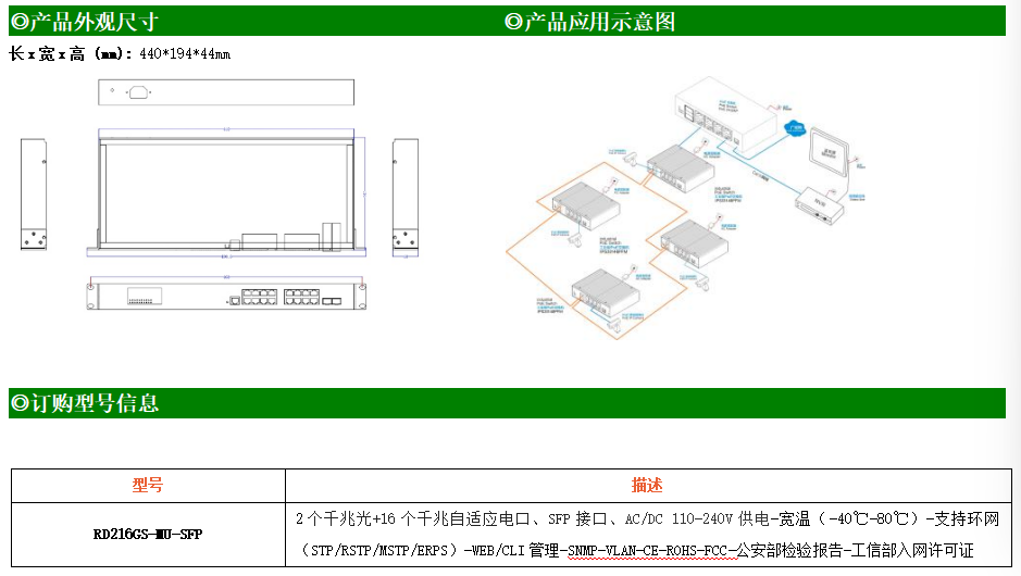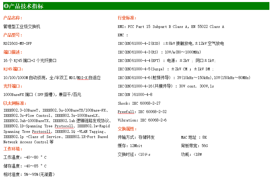 RD216GS-MU-SFP是網(wǎng)管型工業(yè)以太網(wǎng)交換機,產(chǎn)品符合FCC、CE、RoHS標準。支持2個千兆光口和16個千兆電口;支持工業(yè)現(xiàn)場所需的以太網(wǎng)二層協(xié)議,保證通信網(wǎng)絡(luò)的穩(wěn)定性;該系列交換機采用低功耗、無風(fēng)扇設(shè)計,確保無噪聲干擾,同時支持-40~80℃工作溫度和良好的EMC電磁兼容性能,保證在惡劣的工業(yè)環(huán)境中保持穩(wěn)定的工作,為工廠自動化,智能交通,視頻監(jiān)控等工業(yè)應(yīng)用領(lǐng)域組建快速穩(wěn)定的網(wǎng)絡(luò)終端接入網(wǎng)絡(luò)提供安全可靠的解決方案。