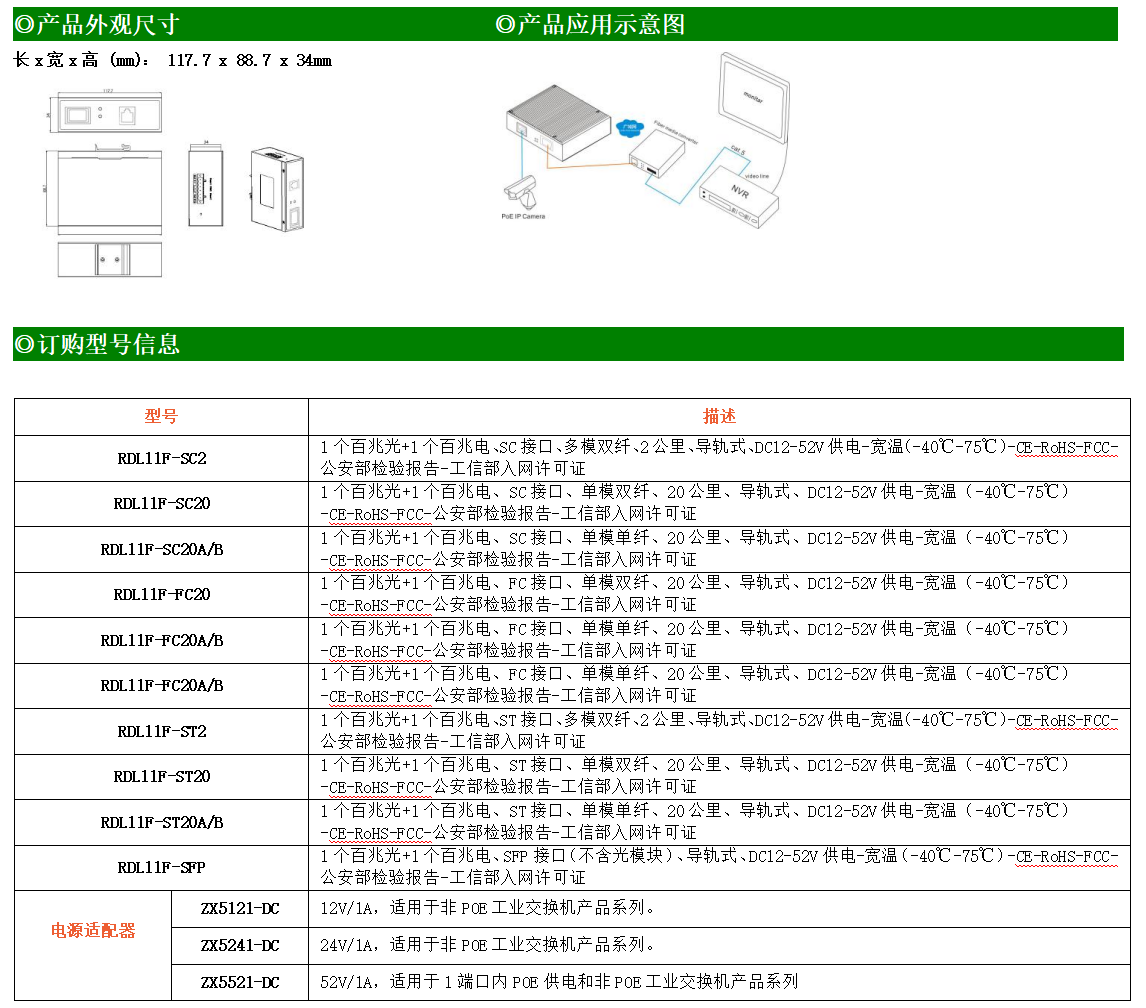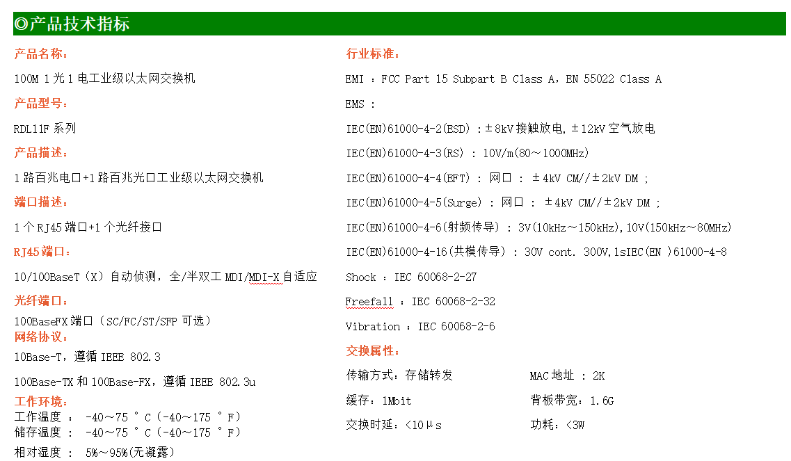 1路百兆電口+1路百兆FX光口工業(yè)級以太網(wǎng)交換機,支持1個10Base-T/100Base-TX電口和1個100Base-X(SC/ST/FC)光口。產(chǎn)品符合FCC、CE、ROHS標準。RDL11F系列交換機具有-40℃~75℃的工作溫度,具有超強的堅固度能適應(yīng)各種嚴苛環(huán)境,也可以非常方便的安置在空間緊湊的控制箱中。導軌的安裝特性、寬溫操作及擁有IP40防護等級的外殼及LED指示燈,使RDL11F成為一個即插即用的工業(yè)級設(shè)備,為用戶的以太網(wǎng)設(shè)備聯(lián)網(wǎng)提供可靠、便捷的解決方案。