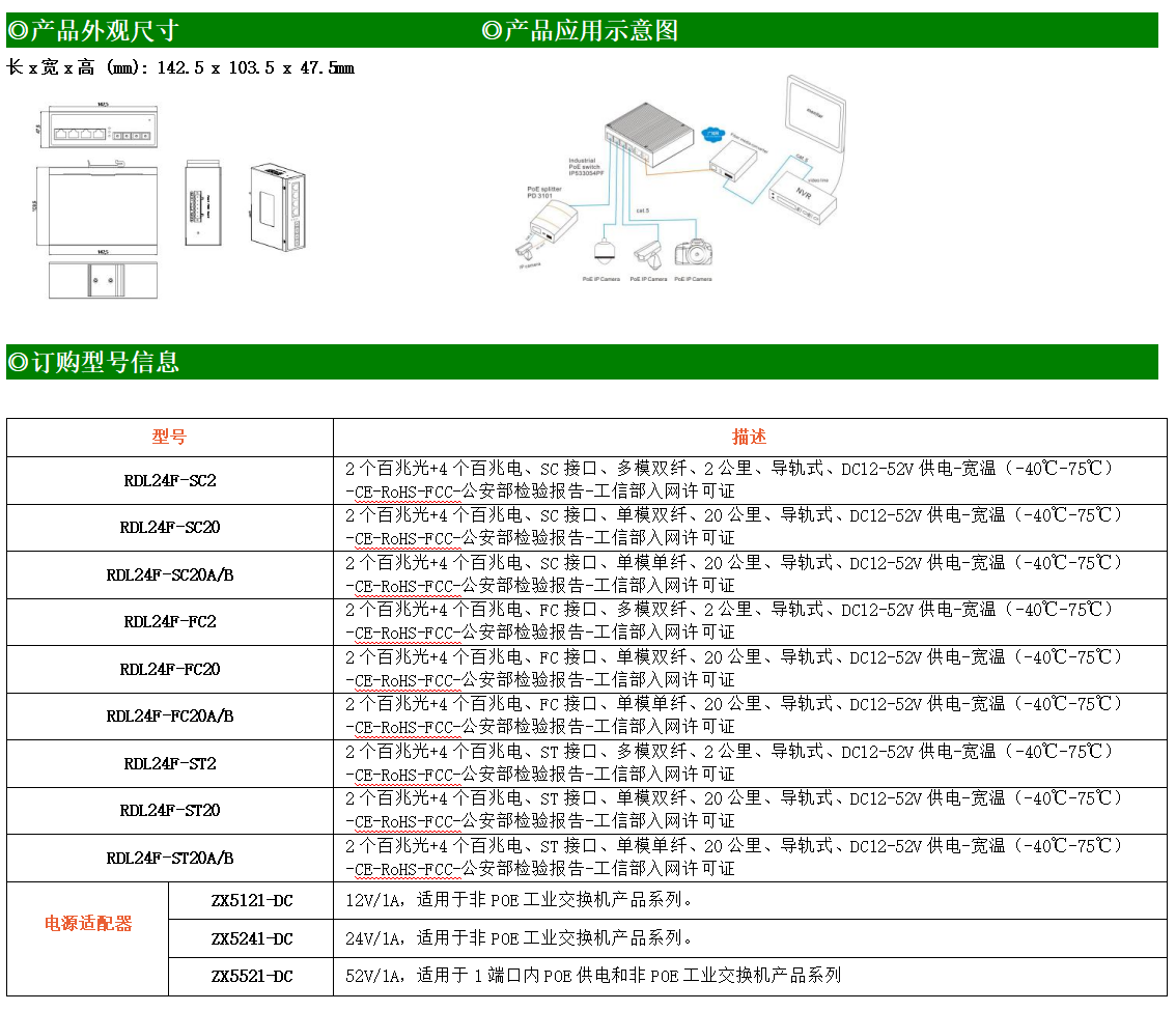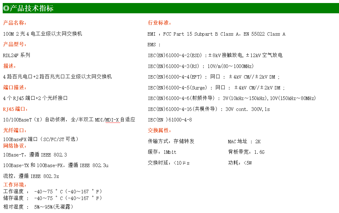 4路百兆電口+2路百兆FX光口工業(yè)級以太網(wǎng)交換機,支持4個10Base-T/100Base-TX電口和2個100Base-X光口。產(chǎn)品符合FCC、CE、ROHS標(biāo)準(zhǔn)。RDL24F系列交換機具有-40℃~75℃的工作溫度,具有超強的堅固度能適應(yīng)各種嚴(yán)苛環(huán)境,也可以非常方便的安置在空間緊湊的控制箱中。導(dǎo)軌的安裝特性、寬溫操作及擁有IP40防護等級的外殼及LED指示燈,使RDL24F成為一個即插即用的工業(yè)級設(shè)備,為用戶的以太網(wǎng)設(shè)備聯(lián)網(wǎng)提供可靠、便捷的解決方案。