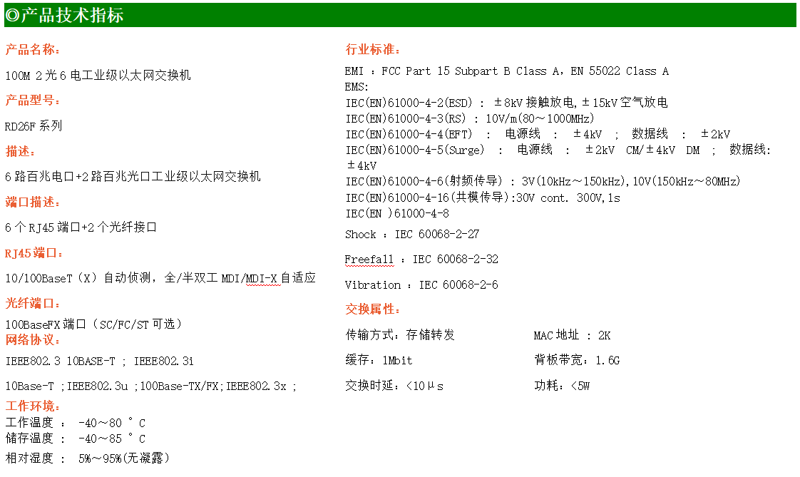 6路百兆電口+2路百兆FX光口工業(yè)級(jí)以太網(wǎng)交換機(jī),支持6個(gè)10Base-T/100Base-TX電口和2個(gè)100Base-X光口。產(chǎn)品符合FCC、CE、ROHS標(biāo)準(zhǔn)。RD26F系列交換機(jī)具有-40℃~80℃的工作溫度,具有超強(qiáng)的堅(jiān)固度能適應(yīng)各種嚴(yán)苛環(huán)境,也可以非常方便的安置在空間緊湊的控制箱中。導(dǎo)軌的安裝特性、寬溫操作及擁有IP40防護(hù)等級(jí)的外殼及LED指示燈,使RD26F成為一個(gè)即插即用的工業(yè)級(jí)設(shè)備,為用戶的以太網(wǎng)設(shè)備聯(lián)網(wǎng)提供可靠、便捷的解決方案。