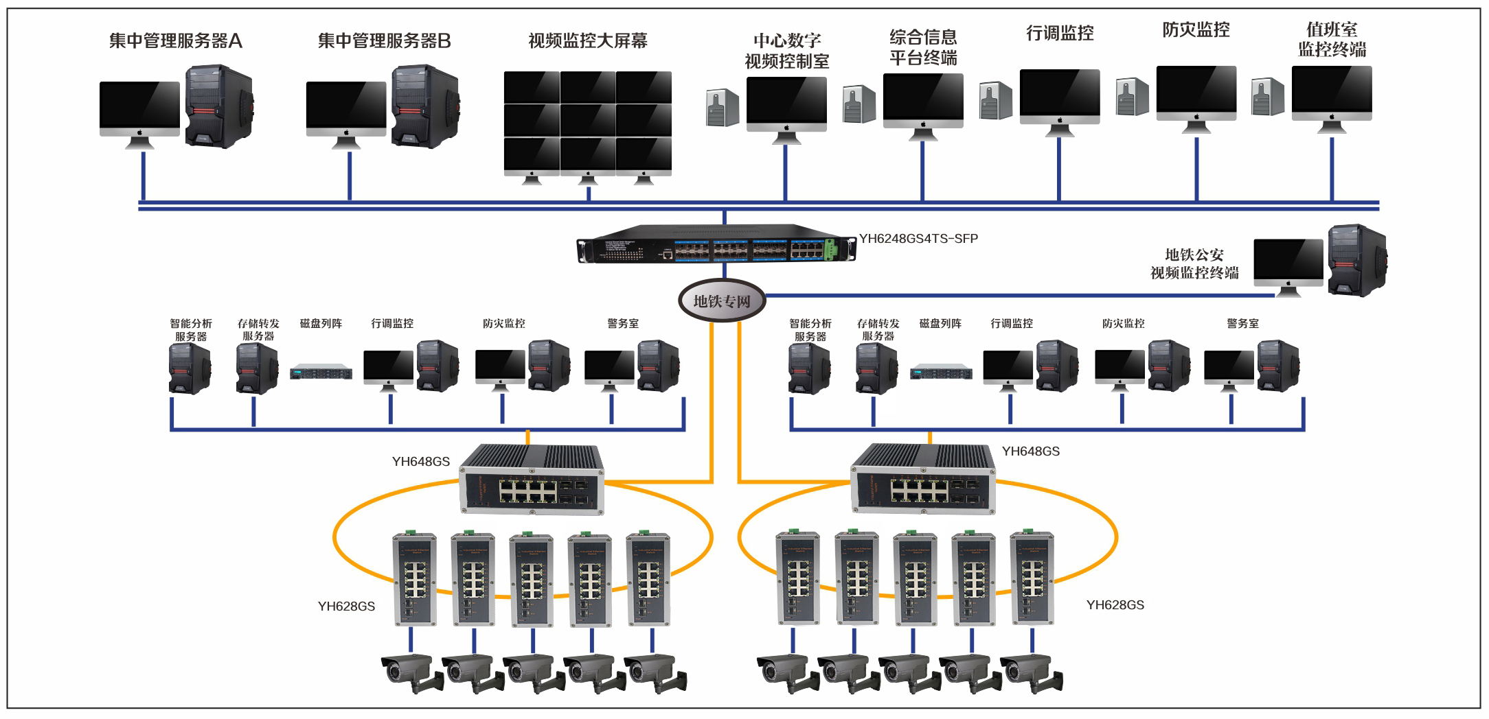 宇航在地鐵IP視頻監(jiān)控解決方案中采用了YH6248GS-SFP,YH628GS,地鐵視頻監(jiān)控系統(tǒng)分為兩部分:運營視頻監(jiān)控和公安視頻監(jiān)控。運營的調度員需要實時監(jiān)控車站,車內客流及乘客上下車等情況,以確保運營安全,快捷,準時,在發(fā)生緊急情況,如火災,反恐,自然災害等,可為相關人員提供事發(fā)現場實時的圖像。在軌道交通設備監(jiān)控系統(tǒng)解決方案中采用維修與備用中心采用環(huán)網交換機進行環(huán)網冗余連接,線路中心BAS系統(tǒng)采用核心交換機主設備連接模式與核心交換機相連,保障了各個監(jiān)控點監(jiān)控到位,與正常通信提高網絡數據傳輸高效性。